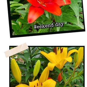 今日のお花 ユリ💛❤ 毎年、咲いてくれる元気色のスカシユリです。 昨年、寄せ植えに使用斑入りミズヒキ💚🩷 🍀ワサワサの秋明菊の葉(畑の隅っこで・・) 🏷8日は葉っぱの発表会 🏷日曜日のコラージュ 🏷春のウキウキガーデン