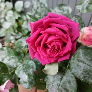 梅雨に、入りました☔ 花は、綺麗に咲いているのに、🌿葉は、見事なうどん粉病😟 カットしました✂️🌹 赤い薔薇ですが、本来の色が出ないスマホ撮り😅 🏷真っ赤な火曜日