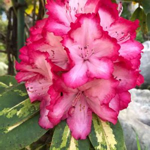 シャクナゲ🌸🌿 今年もほったらかしガーデンで咲きました💗 よく見ると葉っぱが斑入りだったのね🍃✨ 亡き義父母のお花🌸 何年も見ているのにやっと気付いたとは😅 やだぁオシャレじゃないですかぁ(◍︎•ᴗ•◍︎)♡︎ʾʾ