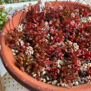 紅稚児✿.*・ 駄温鉢に植えて3年は経ってるかな? 鉢隙間なく真っ赤な紅稚児の上に白い花がぽんぽん咲いているのを想像💭楽しみ〜‼️