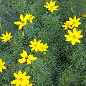 おはようございます。 庭でイトバハルシャギクが咲いています。 細い葉っぱ🌿の中に咲く黄色いお花がきれいです。