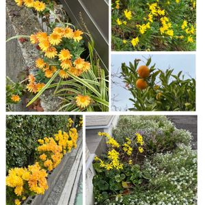 今日のお花 ①イソギク 磯菊 我が家 ②キンバイタウコギ 金梅田五加木 霜月秋桜 ③ヒメヒマワリ 姫向日葵 ④⑤ナツミカン 夏蜜柑 合っていますでしょうか? ②③同級生の花友さん宅 ④⑤ご近所散歩