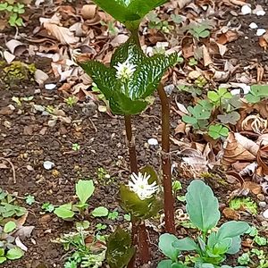 雨で散った雪柳の花びらとともに。。 溢れ種で増えてます 鉢から種がこぼれて今は地に