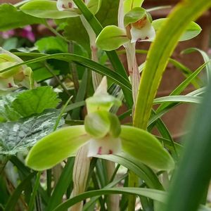 シュンランとともに水仙の葉の影で 可愛そうです。 やっぱり水仙はお引っ越しかな