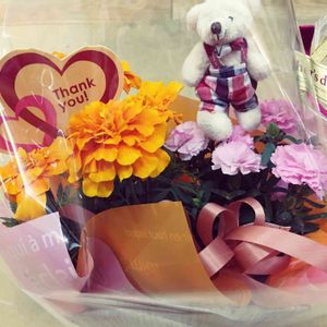 長女から母の日のお花💐 マリーゴールドとカーネーションのギフト🤗 あと2人は、な〜にかなぁ😚 このお花は見えるところに飾っておこう😆‼️