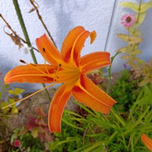 おはようございます☀ オレンジ色のユリ?石垣の上からひょっこり。 朝日に照らされて美しかったです🌅