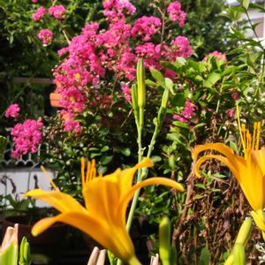 百日紅が 朝陽をあびとても綺麗なので、思わず撮りました。 ノカンゾウ が引立ててるようにも 見えました。 😅