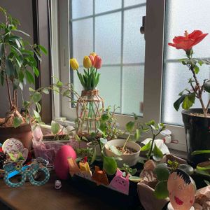 今日から4月🌸 タイミングよく、この春2つ目のハイビスカスが咲いてくれたので、それも写すべく、玄関の靴箱上をpicしてみました😊 先日植え替えをしたガジュマルとペペロミア💚 特に変化がないのは、うまくいった証拠でしょうか?😅 カランコエは花後にバッサリカットしたのですが、すでに脇から新芽を出し、どんどん成長中😳 相変わらず強いです🤣 チューリップはフェイクですが、こうして見ると分からないですね🌷 子どもたちとの作品など小物も飾って、イースターっぽく春らしくしています😊 今月もよろしくお願いします❤️