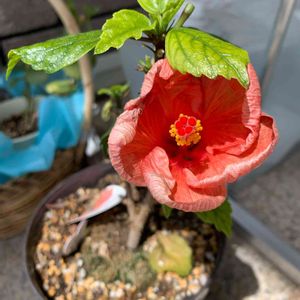 ハイビスカスのアドニスレッドが咲きました。 タグは真っ赤だったのですが、実際は朱色に近いです。