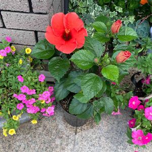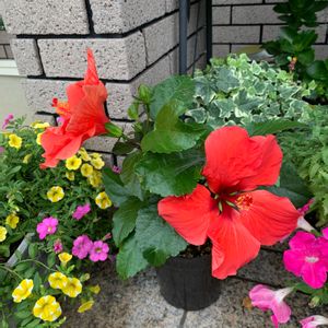 昨日に引き続き、ハイビスカスが開花🌺 私も見て〜😆の勢いに、少し鉢の向きを動かしました😊 昨日咲いた子の方もまだまだキレイです✨ お隣のペチュニア、カリブラコア、スーパーベルと合わせ、ここは元気な原色コーナー💛💕❤️ 玄関前のスペースに置いている鉢物コーナーですが、少し離れたポストから見てもしっかり目を惹きます❣️