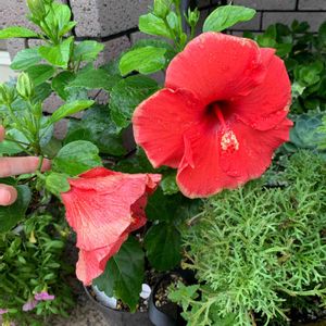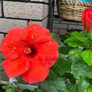 今日もさらに一輪開花のハイビスカス🌺 昨日咲いたお花の方は、やはり降り込んでいる雨に濡れ、うなだれてしまっていましたが、気温が低いためかキレイなお花はキープ❤️ そっと支えて、お花同士をご挨拶させてみました😊 ちょっとツンデレ風?(笑) どんよりした1日でしたが、大きな真っ赤にパワーをもらいました🤗