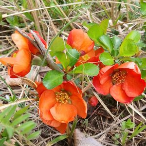 4月は卯月、卯の花の月。穏やかな陽気の春の息吹に誘われ、沢山の草花たちが咲きだし、虫たちは土中から顔を出し活躍し始める時季。 私の散歩道の道際等の草花たちも、自己表現を大きくし始めている--- 3月からの、草花達の満面の姿、姿---その12。 /互いに寄添う鮮やか唐紅の花•蕾、 今年はこの時期ここに観る/  3月は下旬の、何時もの散歩道の道際。 そこは、より狭いと言えよう道路の左右にみる、小さな商店が並ぶ道を抜けて、一歩右に曲がって入っては、住宅街の様相をみせて、歩道際に薮のようになっている低木植栽群が、少し古風にみえよう家の前に居並ぶ鉢群の中。 そこには、幾つかの深紅の花弁や蕾がお互い寄り添うようにして、それらがその花弁を開きながら、また或は未だ花弁を開かずにも、いずれもふっくらとしてお互い寄り添うように密集して。 より近寄ってみる。その深紅よりも鮮やかな唐紅を思わせる花であった。      クサボケ(草木瓜) ・ボケ*<木瓜>(バラ科 ボケ属) *クサボケ含む   (備忘: ボケの属性等について 2/7or2/8 ‘23)                                               ・ボケ/カンボケ<木瓜/寒木瓜>(バラ科 ボケ属)  (備忘: ボケ/カンボケの属性等について 12/29or12/30 ’20)