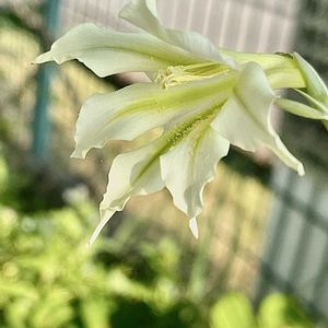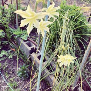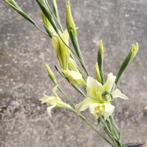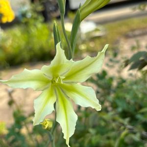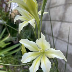 《グラジオラストリスティス》 ダンディ邸の庭にあちこち咲いてきました😃 春に咲く、芳香のあるクリームイエローのチューブ状の花🌼 繊細な花を支える高い花茎で風になびく様子がカワイイ💖😄