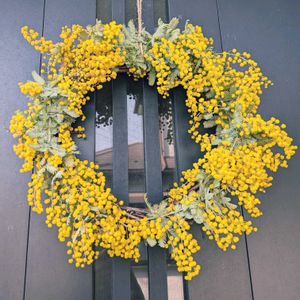 ご近所さんからいただいたミモザで 憧れのリースを作りました💕 嬉しい🟡元気が出る色