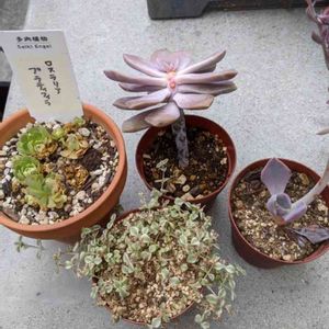 昨日のユーフォルビアとは別のお店で グラプトペタルム属 ペンタンドルム エケベリア属 樹霜(ジュソウ) を連れて来てしまいました😊 可愛い子が少なめな我が家🏡 この手の子には、あまり詳しくないので、あまり聞いた事ない名前の子をチョイス😘