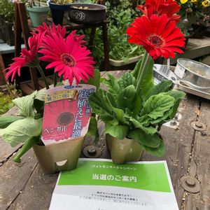 前回当選したボニータ、元気です。 放置気味にしてたら、伸び放題に伸びて風通し悪そうで、調子悪そうだったから、かなり間引きました😋 間引いたら、また生き生きしてきた気がします😊 今回のガーベラは鉢に植えるか、花壇に植えるか、プランターに植えるか迷ってて、そのままにしてたら、家族がさっさと小さいプランターに植えちゃいました😅 横に見切れてるのは、子どもです😁