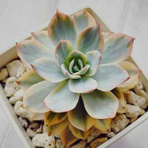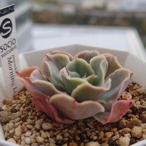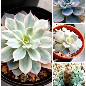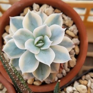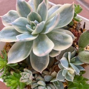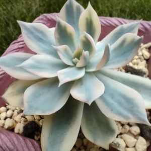 エケベリアのモーニングライト(サブセシリス錦)です🌅 淡いブルーが妖精のようなイメージの品種です🧚♀️斑入りですが、棚の奥の半日陰に置くとすぐ徒長しようとします😅午前中日当たりで午後半日陰になるような場所に置くとご納得の様子💦 夏はパキフィツムやグラプトペタルムたちと陣取りですね😭
