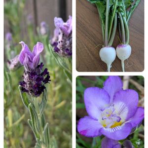 今日は紫色シリーズ🟣 ラベンダー 鉢植えでこの時期咲いてくれます✨ こかぶあやめ雪 肩の部分があざやかな紫色で下白いグラデーションが魅力です🤩 このまま葉っぱまで生で食べられて美味しいんです🥰 フリージア徐々に開花中😃