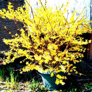 朝の散策路 通り道のお宅の表に、鉢代わりのバケツで、レンギョウが満開です。