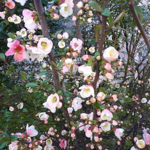 バラ科ボケ属 更紗木瓜(かと思いま) 白花とピンク色の花が一緒に咲く木瓜です。 このお花も春一番に咲き出していました。 今は満開です。 真っ赤な緋木瓜と同じ場所に植えられて春の饗宴のようです。