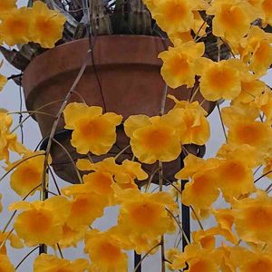 買ってきたセッコク手前 品種名 月丸 黄色い花が咲き始めました。 乾かし気味管理ということ。 昨夜は強い雨だったようで、水が溜まっていたので、急いで捨てました。