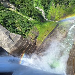 ダムと虹🌈と孫 最初にダムを見た場所からだいぶ降りてきてより間近に見えて迫力も増しました😆✌️ 🌈が綺麗でした😆✌️ 昨日の🌈と2日も🌈が見ることが出来ました😆✌️🙌👏👏👏 この後ケーブルカー🚟で大観峰へ 2023・8・6撮影
