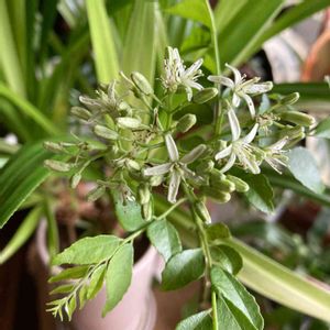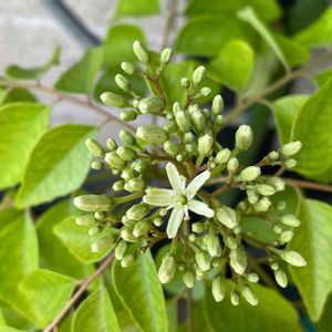 カレーリーフの蕾が膨らんできました☺️ 外で冬越しさせているので、下の方の葉は落ちてしまいますが、暖かくなると新芽が出て花芽も出て来ます。 ザクロの花、アルストロメリアの花も開きかけだった物が今朝開いていました😊