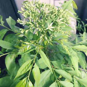 育て始めて一年目のカレーリーフに花が咲きました。小さな花から蘭の様な香りが漂っています☺️