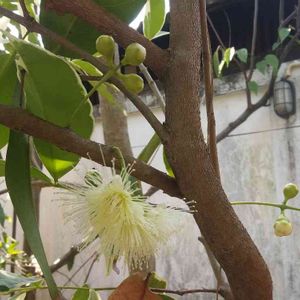 レンブの斑入り種が初開花しました。 だけど斑入り種にも関わらず、8割方は葉に斑なし。陽射しが強いと斑がなくなるのかな? 果実の収穫が終わったら遮光してみよっと。