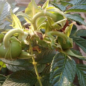 あれ?!このハマナスは結実したみたい。別の種子から生えた個体の花粉を受粉させないと結実しない(他家受粉)けど、白花ハマナスと一緒に売られていたから、たぶん園芸店で受粉したんだろうな。種蒔いて別の個体を作ったろ。