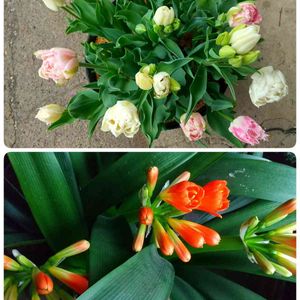 こんにちは、今日は雨ですね🎵軒下に避難したチューリップともうすぐ咲く君子蘭です。 🏷️蕾組の子 🏷️金曜日の蕾たち