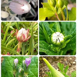 ↖️から時計回りに シレネユニフローラ モッコウバラ ミヤコワスレ ハナビシソウ 日本桜草 アルメリア 一昨日までの暑さで蕾ラッシュです 🏷️蕾組の子 に参加させて頂きます
