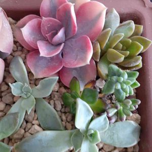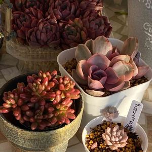 今日、届いた子たち(メルカリっ子)と先日チョンパ✂️して乾かしてた子たち全部まとめて寄せ植え♡ 真ん中は、この鉢に根付いてた七福神のカケラ。 伸びしろを残してスペース確保♡ めっちゃ贅沢盛りになった❣️