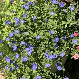 秋めいて生き生きの庭の花🩷 ①梅雨時半分真っ黒に枯れてダメかなと諦めていたけど復活💪アメリカンブルー🩵 ②玄関前のアメリカンブルー🩵 ③④スーパーベルダブルチェリーリップル ⑤庭の一角、常にこぼれダネのトレニアが映り込む😅🩷