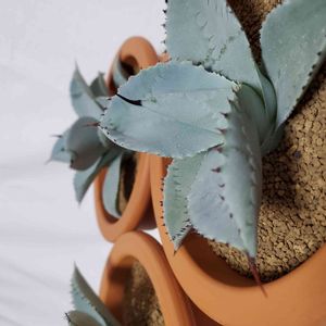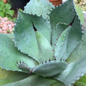 アガベ ドラゴントゥース サボテンの展示にて 青白い葉に細かい赤いトゲが特徴