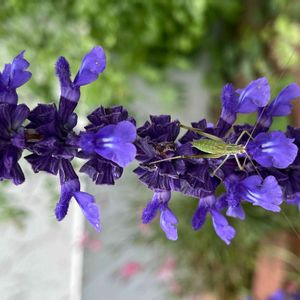 6月15日散歩道🚶♀️🚶🏻♂️曇り 緑道脇の花壇にて、サルビアでもない❓ AI君 花の名は❓回答→ブルーサルビア 確率51%