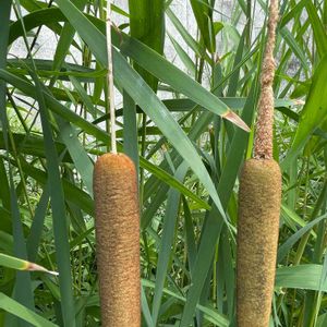 6月16日散歩道🚶♀️🚶🏻♂️ 高い擁壁の側溝辺りが湿地の感じで雑草やアメリカオニアザミなど群生している中に ガマも群生し広がっている。 ガマの穂が10本位出ている これが花か❓