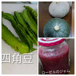 お向かいと斜めむかいさんとにいだだいた四角豆と南瓜今日南瓜煮ましたよローゼルでジャム作りましたよ✌️♥️♥️♥️初めてのローゼルジャム甘酸っぱくてヨーグルトに入れて食べてますよ🔴🔴🔴