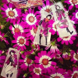 お散歩ちゃんより♫ お雑煮頂いて、サイネリアちゃんをご用意しました。 お散歩ちゃん、3人! いくらモデル体型でも、、(実際は金具のキーホルダーが重いの😳💮)ガムばってくれたサイネリアちゃんを、褒めたいこぺんちゃんです♫💐💮