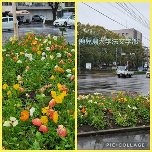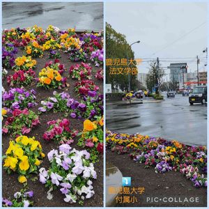 3/9(木)に、通りかかった鹿児島大学法文学部信号付近の花壇。 付属小側の花壇には色とりどりのパンジーが綺麗でした✨💖 丁度、雨の中、児童達が下校中だった。この花壇には、噴水⛲も設置されていた。 ❇️パンジー