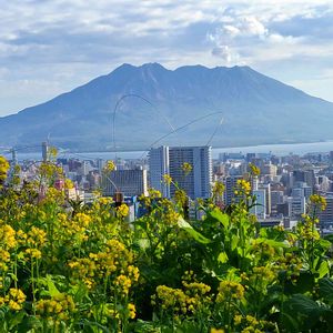 🏷️今日のお花 ❇️菜の花 '23.1.11撮影 地元ニュースで菜の花の開花を聴いて出かけたのでした🚗 菜の花、咲き始めでみごとでした。花の甘い香りは春を予感させてくれました✨💖 鹿児島市内武3丁目の海抜110mの高台にある長島美術館庭園からの眺め。 錦江湾にそびえ立つ雄大な桜島や市街地を一望できる👀 庭園には亜熱帯樹が豊富に植栽されてます🌴