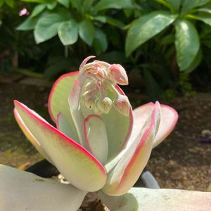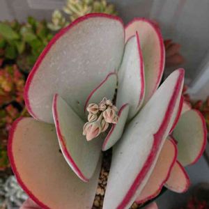 名前不明多肉さん𓂃𓂂🍃 成長点の葉っぱがだいぶ大きくなりました☺️ ふっくら肉厚の葉っぱに赤い縁どり ネットで似てる子を見つけたんだけど名前を忘れてしまいました 君の名は?(ᵔᴥᵔノ)ノナンダイ 追記 教えていただき、オルビキュラータ(白眉)と分かりました!