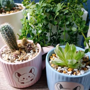 チンチラマグカップが可愛かったので、植物植えてみました🤭🩷🩵 pic②③サボテン偽家族ꉂ🤣w𐤔 実生っ子ちゃん1サボがお星様になり、新たにサボテンからポロリと生まれたサボちゃんを植えてみました🌵 いつポロリと落ちたのかわからないサボちゃんだったので、根っこがちょっとカリカリに…💧根付くのに時間掛かりそう😅💦 🌵実生っ子…なんかあんまり成長を感じないな〜( ・᷄ὢ・᷅ )ウーン… サボテン偽家族は今の所、ベランダで過ごしてます☀ pic④⑤日比谷公園ガーデニングショーでお迎えした京の華錦🤍💚 とても綺麗な子です🥰水色のカップにお似合い🩵 でも、以前からいる名無しのハオルチアバリエガータにそっくりでした😅 ちなみに後ろに写ってるペペロミア デピーナちゃん💚花咲いてました🤭 やっぱり、じみー(*´ฅ`*)ププッ