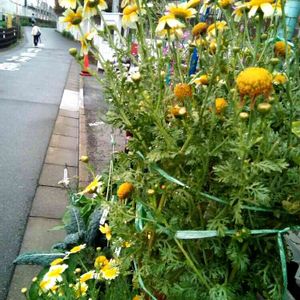 咲き暴れる春菊の花 通行人に襲いかからないように、仕方ないのでビニールテープで縛ってますが咲く花より摘む花が多くなり腱鞘炎になりそうなので、そろそろ引退してもらい仙人が育てたトマト達にプランターを譲って貰うことにしました(笑)