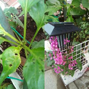 このソーラー害虫駆除灯の横にパプリカの赤と黄ジャンボピーマンの3人組!がガードしてますが何故か?1番虫に食われてる(笑)