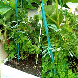 パセリ君ごめんなさい 明日葉君の下でイジメられていたんだね!いま明日葉君にお仕置きで葉っぱを後ろに後退させたからね!それに支柱を立てて姿勢を正して行けるようにしたからね!いい花を咲かせてくださいよ(笑)