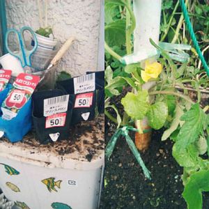 覚えてますか? 接ぎ木苗のミニトマト 1ヶ月前298円でしたが 支柱が折れていて 処分価格の50円で購入 わき芽が支柱化してきました!多分もう少しで地植えできます(笑)