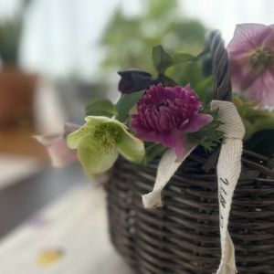 テナチュールが咲いてくれたので、くすみカラーをバスケットに飾ってみました。 2枚目はカット後、花瓶にさしたもの。 3枚目は、庭で咲いていた時。
