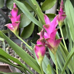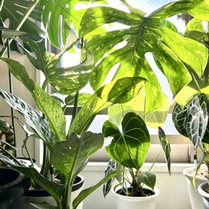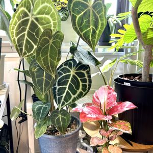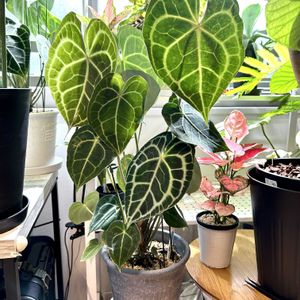 お気に入り😃アンスリウム原種クラリネルビウム😊あっという間に大きくなりました😊高さ70cm超えた😊育てやすいです〜 アンスリウム・クラリネルビウムは、アンスリウムという大きな属の中の**「原種(種小名: clarinervium)」**の一つです。 アンスリウムの仲間は世界に600種以上もあるとされ、大きく分けると、花(仏炎苞)を楽しむ「一般園芸種」と、葉の美しさを楽しむ「原種系アンスリウム」に分けられます。 クラリネルビウムは後者の**「葉の美しさを楽しむ原種系アンスリウム」**の代表格です。 🍃 葉を楽しむ原種系アンスリウムの主な仲間 クラリネルビウムと同じように、葉のユニークな形や葉脈の美しさが魅力の原種系アンスリウムには、以下のような種類があります。 1. ハート型の葉と白い葉脈を持つ種類 クラリネルビウムと同様に、ベルベットのような質感の濃い緑色の葉に、白やシルバーのくっきりとした葉脈が入る種類です。 • アンスリウム・クリスタリナム (A.\ crystallinum) • 葉の形はクラリネルビウムに似たハート型で、白くはっきりとした葉脈が特徴です。 • 特に葉が丸みを帯びた**「ドラヤキ」**と呼ばれる品種も人気があります。 • 和名では「シロシマウチワ」とも呼ばれます。 2. ユニークな形の葉を持つ種類 ハート型とは異なる、特徴的な形や質感を持つ種類です。 • アンスリウム・フォルゲッティ (A.\ forgetii) • 葉の形が**小ぶりな涙型(または円形に近い)**で、付け根の切れ込みがない、ユニークな形をしています。 • 濃い緑色の葉にシルバーの葉脈が入り、成長するにつれて葉脈のシルバーが濃くなるのが特徴です。 • アンスリウム・ワロクアーナム (A.\ warocqueanum) • 細長い縦長の葉を持つ、非常にエレガントな種類です。 • 葉脈はあまり目立ちませんが、葉の表面全体がベルベットのような質感と光沢を持ちます。 • アンスリウム・ビレナオルム (A.\ veitchii) • 非常に大きく縦長の葉を持ち、成熟すると30cm以上になる大型種です。 • 葉の表面には光沢があり、波打つような凹凸(アコーディオンのような見た目)が特徴的です。 3. その他 • アンスリウム・フーケリー (A.\ hookeri):団扇のような丸い葉をロゼット状に広げるタイプで、バリエガータ(斑入り)種も人気です。 クラリネルビウムは、これらの葉を楽しむ原種の中でも、比較的小型で育てやすく、葉脈のコントラストが非常に美しいことから人気が高く、**「ベルベットアンスリウム」**の代表的な種として愛されています。