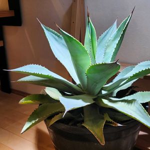 アガベドラゴントゥース😊親株😊いつも外に出しっぱなしですが、久々に室内に入れてみました😊鮫肌のような葉っぱの感触がお気に入りです😊既に子株孫株が6個もあります😊子沢山です〜😊 アガベはリュウゼツラン科リュウゼツラン属に分類される多年草の多肉植物で、南アメリカ北部や北アメリカ南部、中央アメリカが原産地です。 一生の間に花が咲くのはたった一度だけで、咲くまでに数10年~100年かかるとも言われ、「センチュリープラント」とも呼ばれています。 暑さはもちろん、寒さにも強いのが特徴です。 日光を好むので、日当たりのよい風通しの良い場所で管理しましょう。 水やりはやや乾燥気味が基本です。 夏場は土が乾いて数日たってから、鉢底から水が流れ出るまでたっぷり水やりをします。 冬は生育が止まり休眠状態になるため、水は基本やらず、様子を見て月に1~2回程度までにとどめます。 [ドラゴントゥース] 白っぽく丸みのある肉厚の葉が整った形状のロゼットを作る品種。 びっしり並ぶ赤茶色のトゲは歯のようにも見えるけれど、名前は「ドラゴンのつま先(toes)」だそうです。